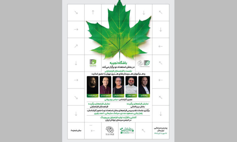 به گزارش خبرگزاری خبرآنلاین به نقل از ستاد اطلاعرسانی و ارتباطات چهلودومین جشنواره بینالمللی فیلم کوتاه تهران، پنج نشست صمیمانه با هنرجویان و هنرآموزان هنرستانهای هنری و فیلمسازان فیلم اول در چارچوب بخش «استعدادهای نو» این جشنواره، در سالن شماره ۸ پردیس سینمایی ایرانمال برگزار خواهد شد.