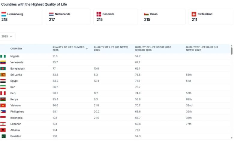 نیجریه در صدر فهرست کشورهایی با پایینترین کیفیت زندگی قرار دارد. بر اساس دادههای سایت Numbeo، این کشور با شاخص کیفیت زندگی ۱۵.۶، پایینترین رتبه را به خود اختصاص داده است. عواملی همچون قدرت خرید بسیار پایین (۱۰.۶)، ایمنی محدود (۳۳.۹) و کیفیت نامناسب خدمات درمانی (۴۹.۱) به این وضعیت دامن زدهاند.