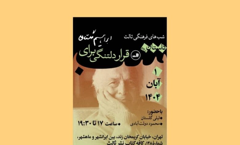به گزارش خبرگزاری خبرآنلاین به نقل از خبرگزاری کتاب ایران (ایبنا)، در ادامه برنامه‌های شب‌های فرهنگی ثالث، مراسم «قرار دلتنگی برای ابراهیم گلستان» با حضور محمود دولت‌آبادی و لیلی گلستان برگزار خواهد شد.